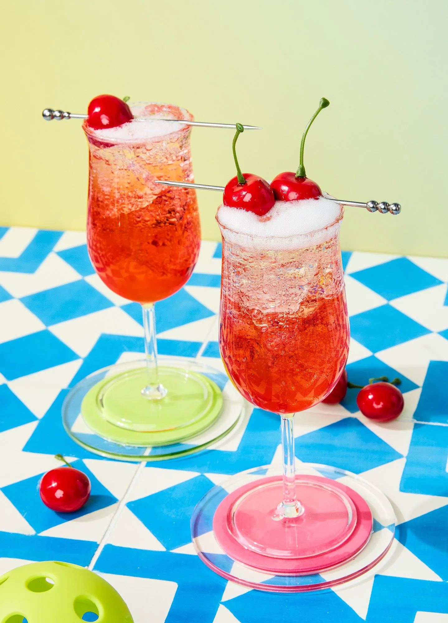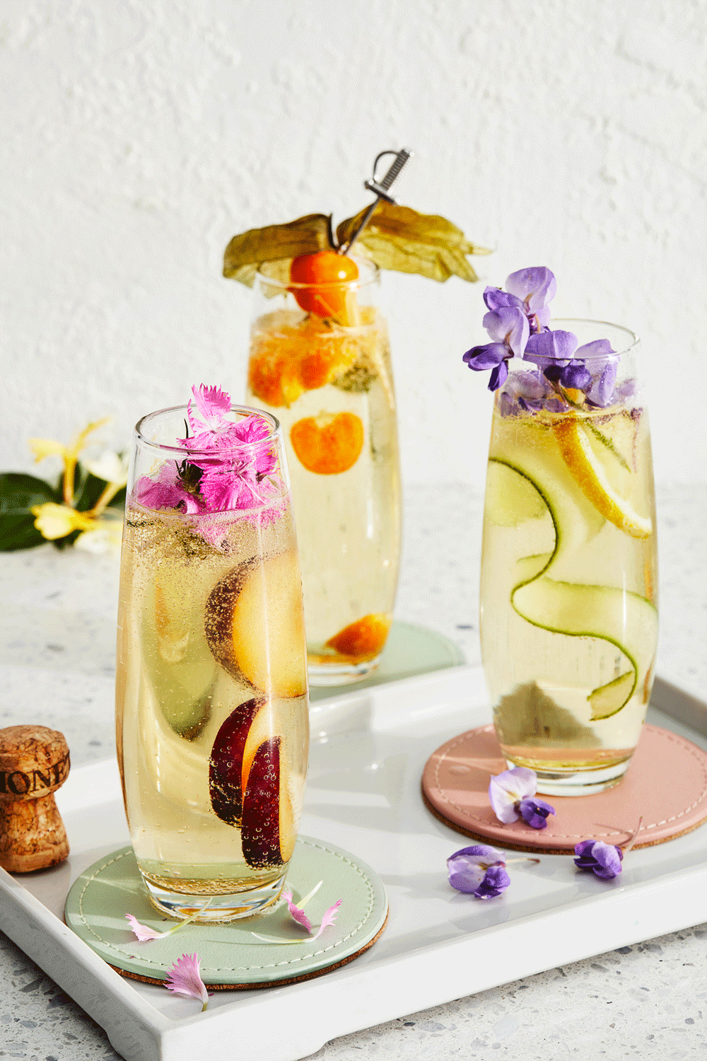 Three elegant cocktails in flutes with fresh fruit and edible flower garnishes on a tray.