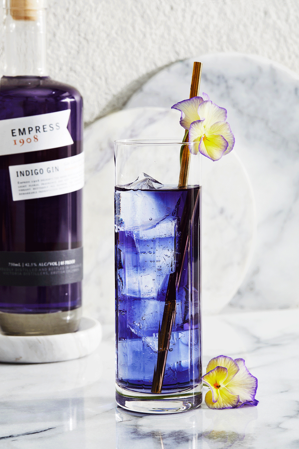 Empress 1908 Indigo Gin in a tall glass with ice and a purple flower garnish, on a marble surface.