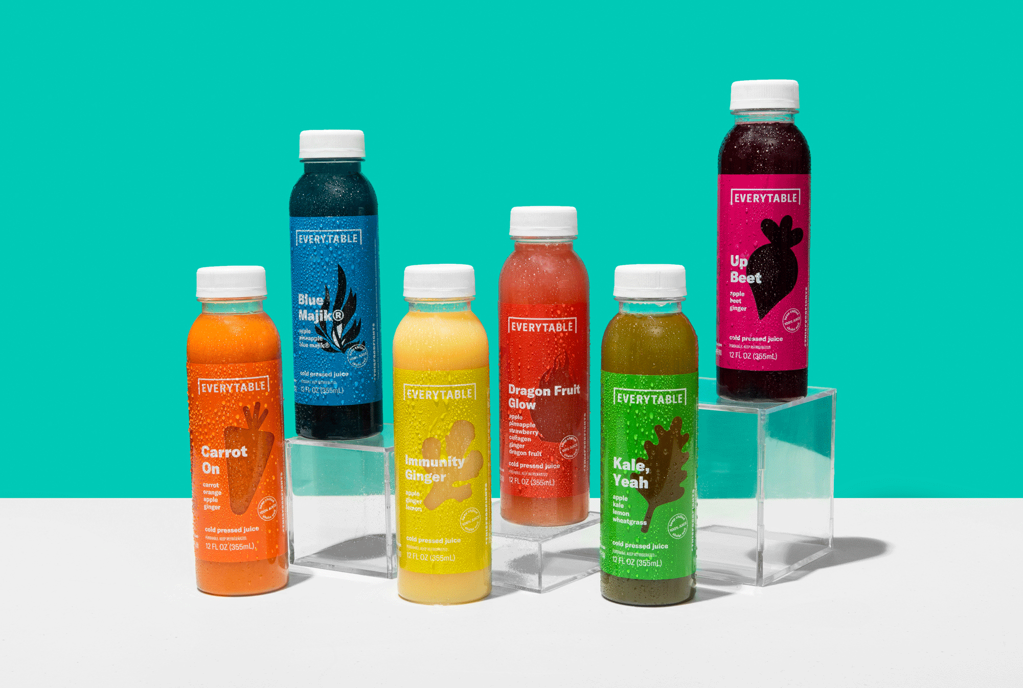 Variety of Everytable bottled cold-pressed juices on display against a turquoise background. Flavors include Carrot On, Blue Majik, Immunity Ginger, Dragon Fruit Glow, Kale Yeah, and Up Beet.