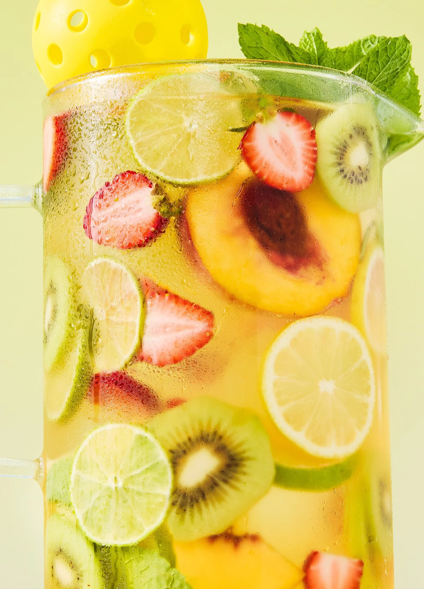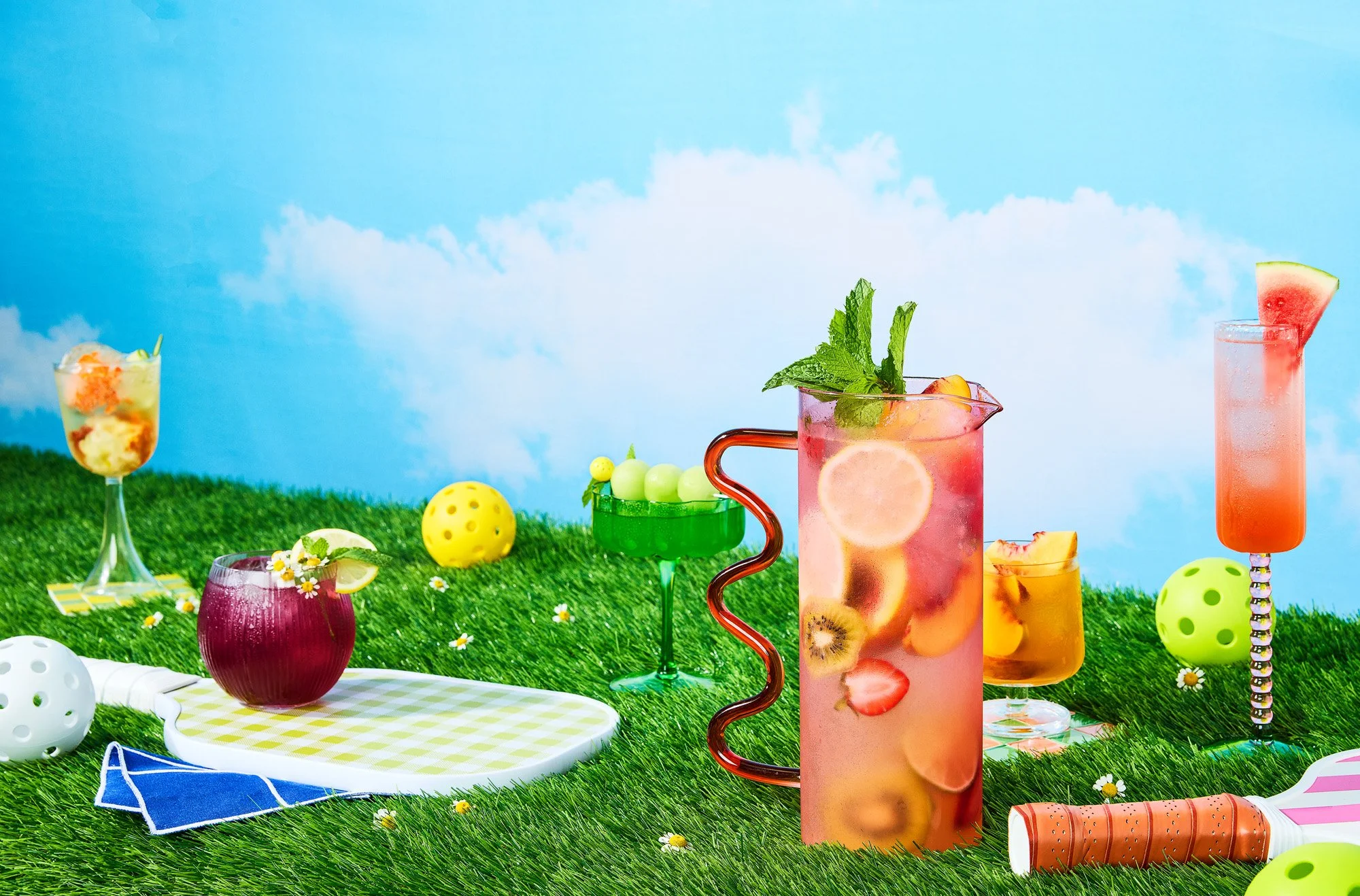 Two colorful cocktails with garnishes on a table next to a pineapple, lime slices, and a small vase, against a pink background.