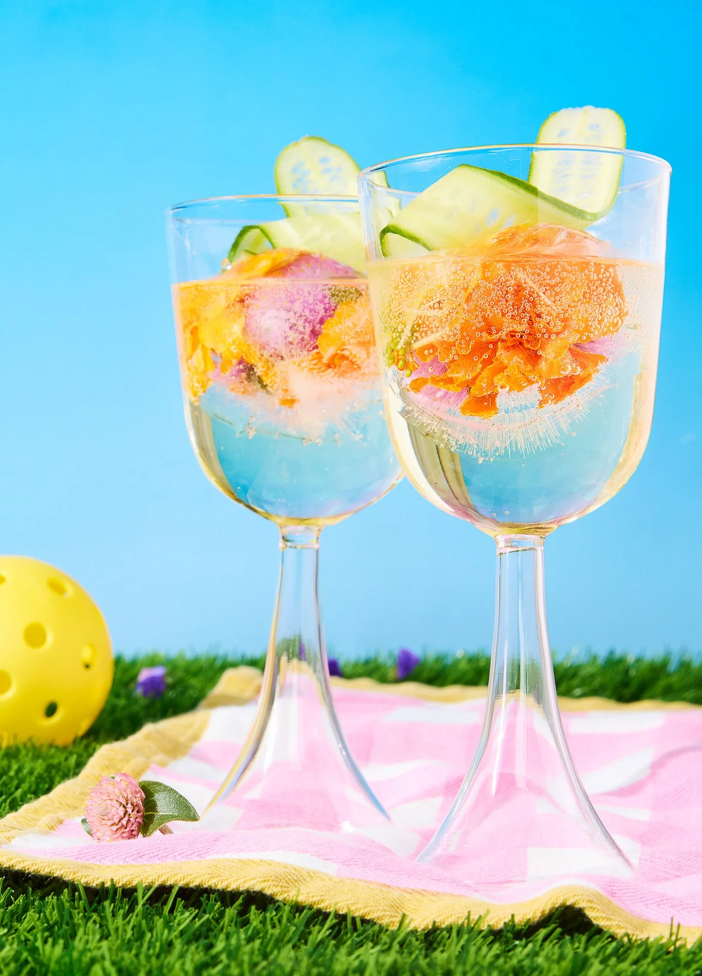 Colorful still life with a tall glass of iridescent liquid on a purple stand, surrounded by a bowl of chips, grapes, a small purple cup, and flowers, set on a purple tiled surface with a purple backdrop.