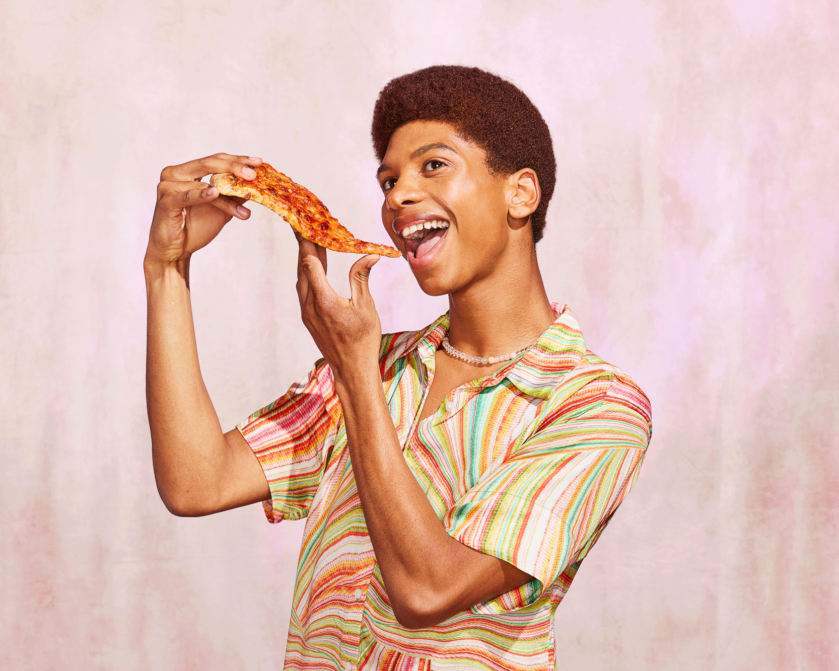 Person wearing a colorful striped shirt eating a slice of pizza against a pink textured background.