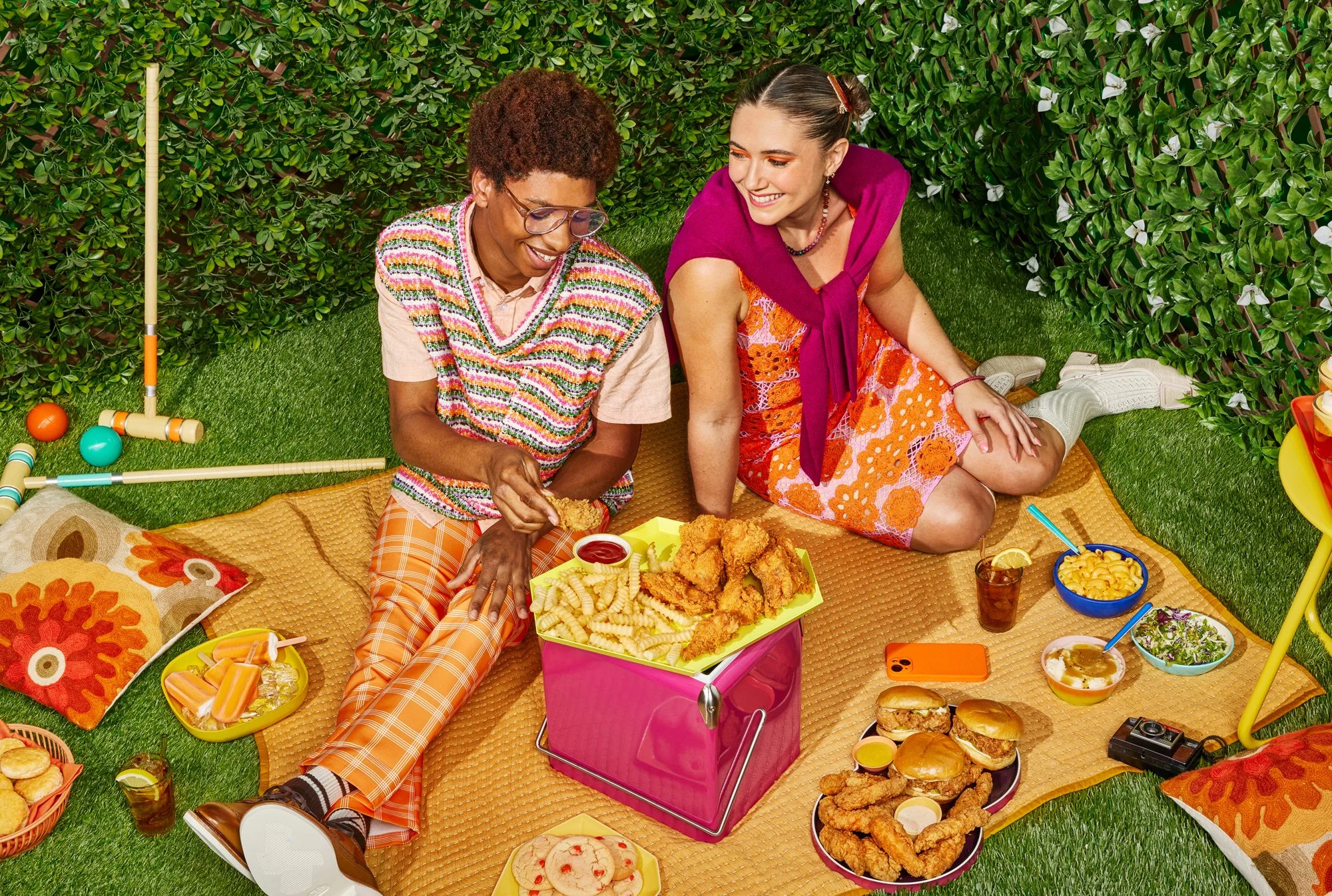 Two people enjoying an outdoor picnic with a variety of food including fried chicken, fries, burgers, popsicles, mac and cheese, and cookies. They are sitting on a blanket with colorful pillows and surrounded by a hedge wall. A croquet set is nearby.