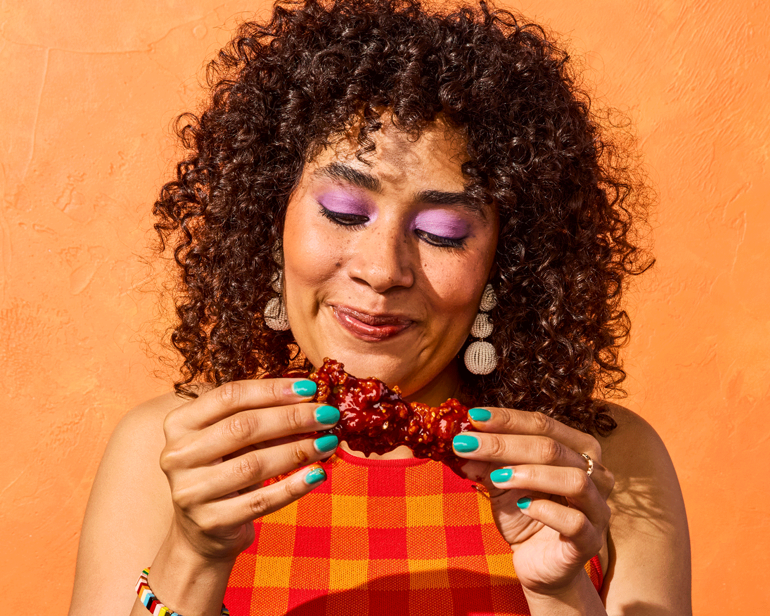 Person with curly hair smiling, holding a piece of fried chicken against an orange background.
