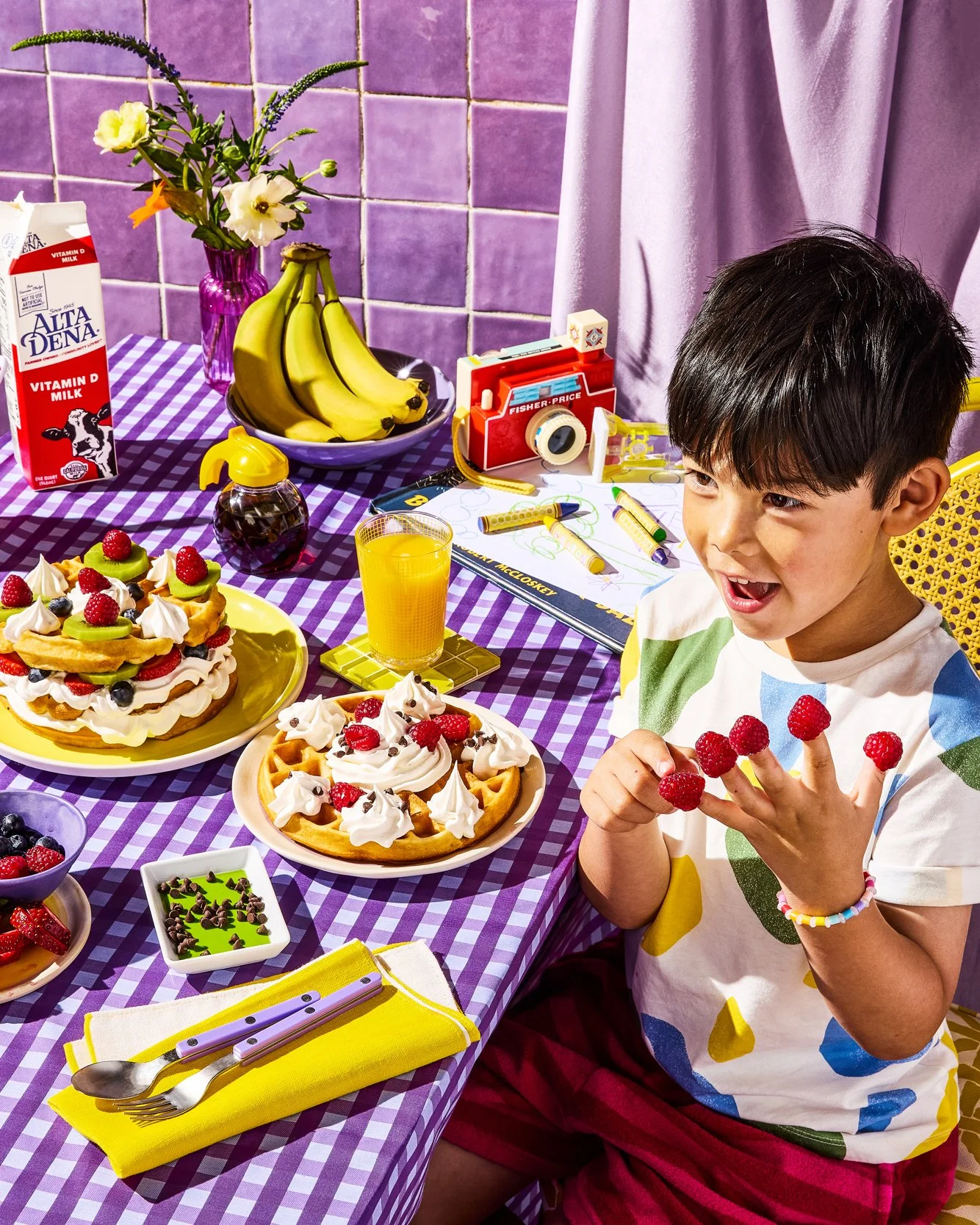 Child with raspberries on fingers at table with waffles, fruit, milk carton, orange juice, and toy camera on purple checkered tablecloth.