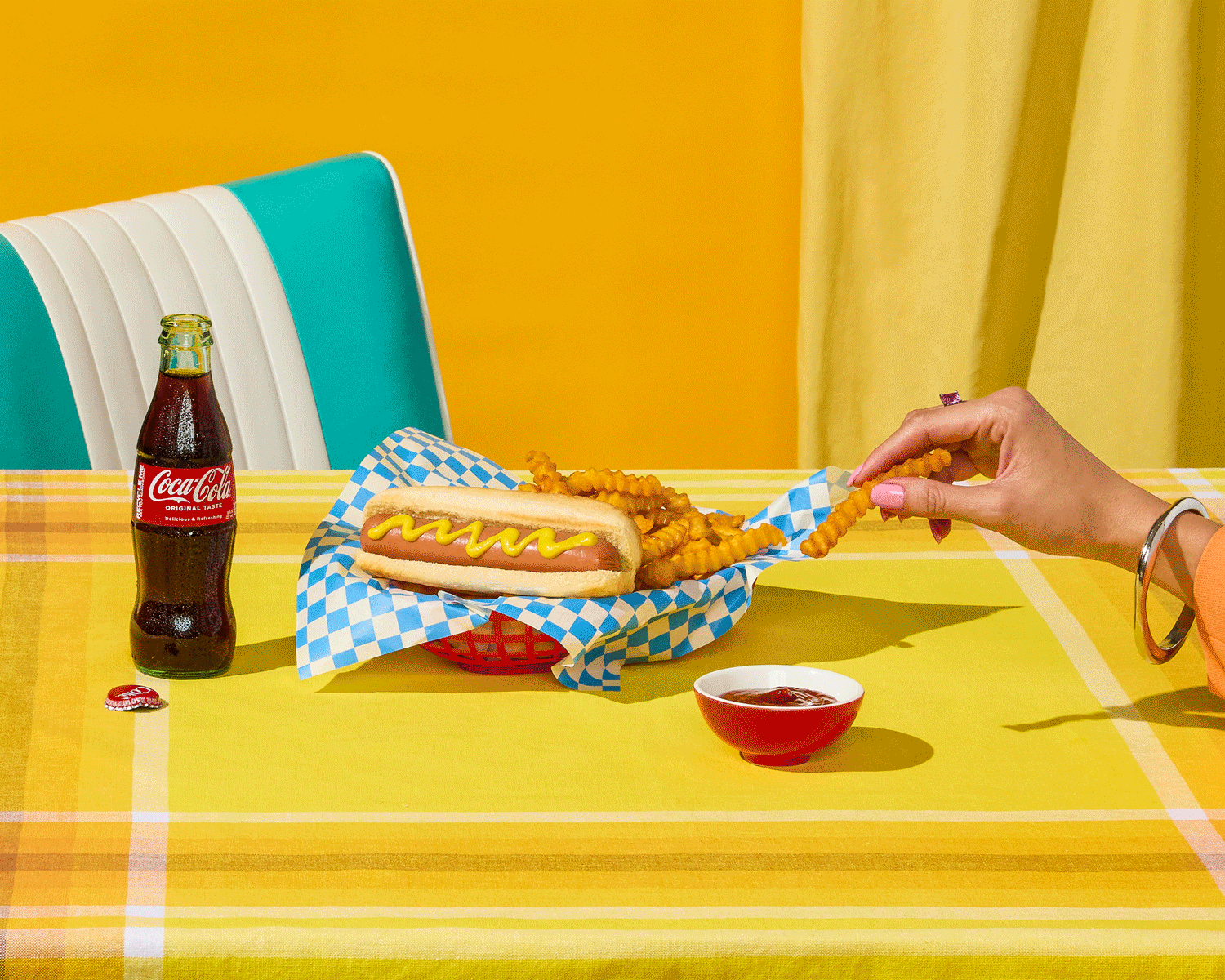 Retro diner setting with a hot dog topped with mustard, crinkle-cut fries, a bottle of Coca-Cola, and a hand dipping a fry into ketchup on a yellow checkered tablecloth.